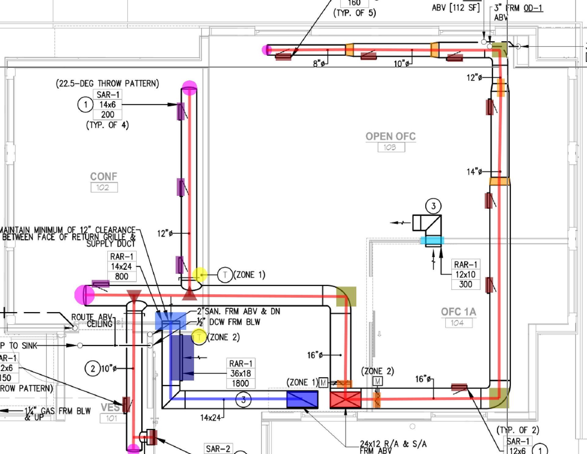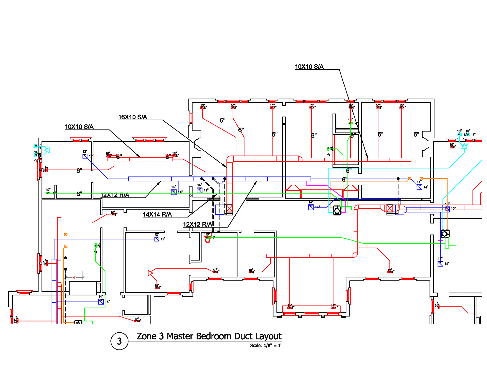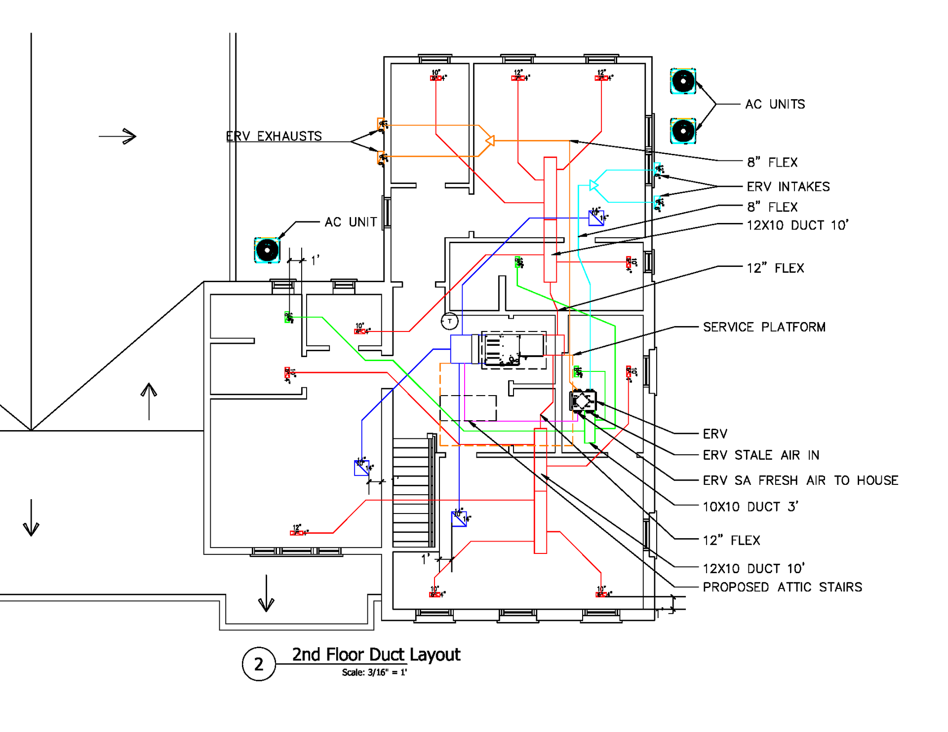 An attic duct layout incorporating a variable speed furnace along with an energy recovery ventilator. We color code the drawings to make them easy for anyone to read.