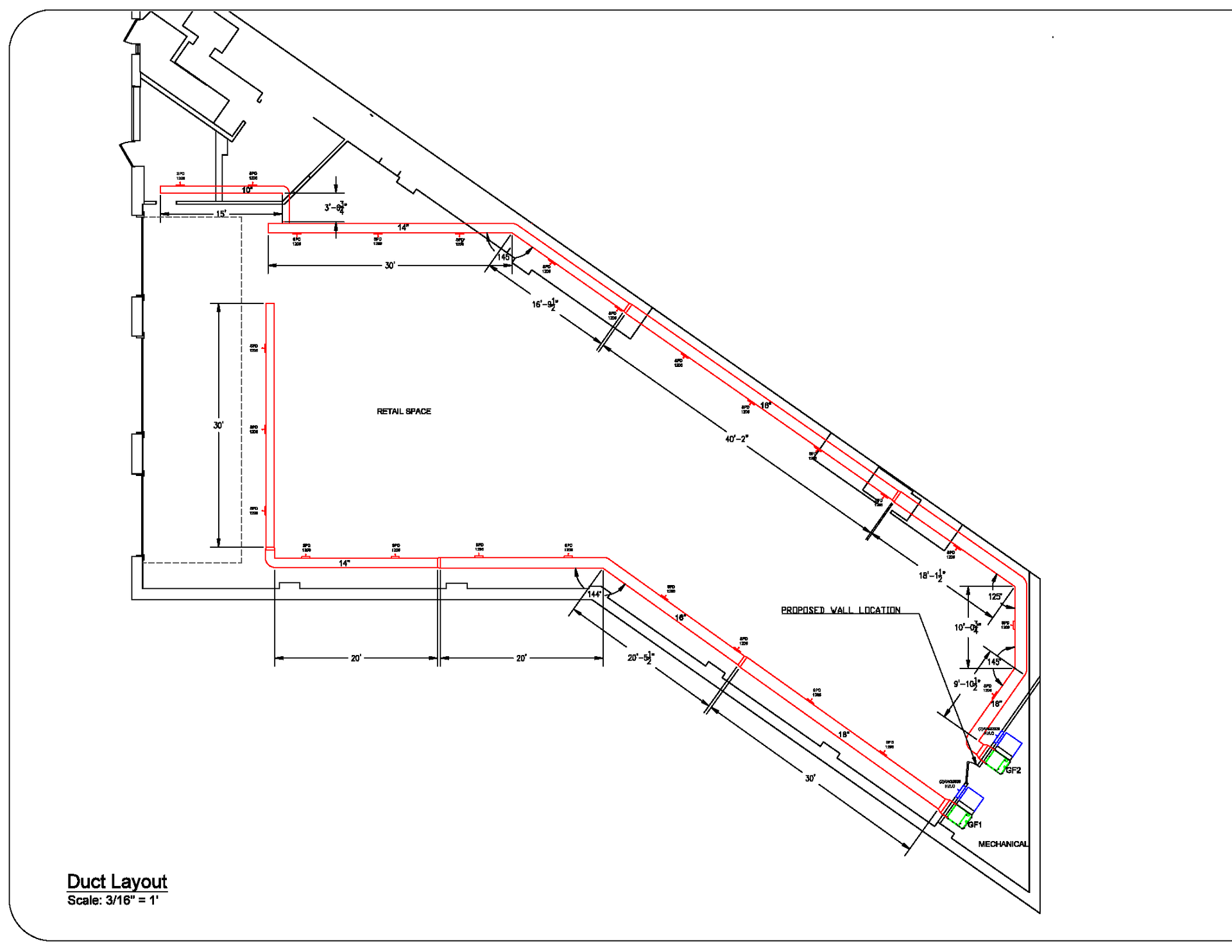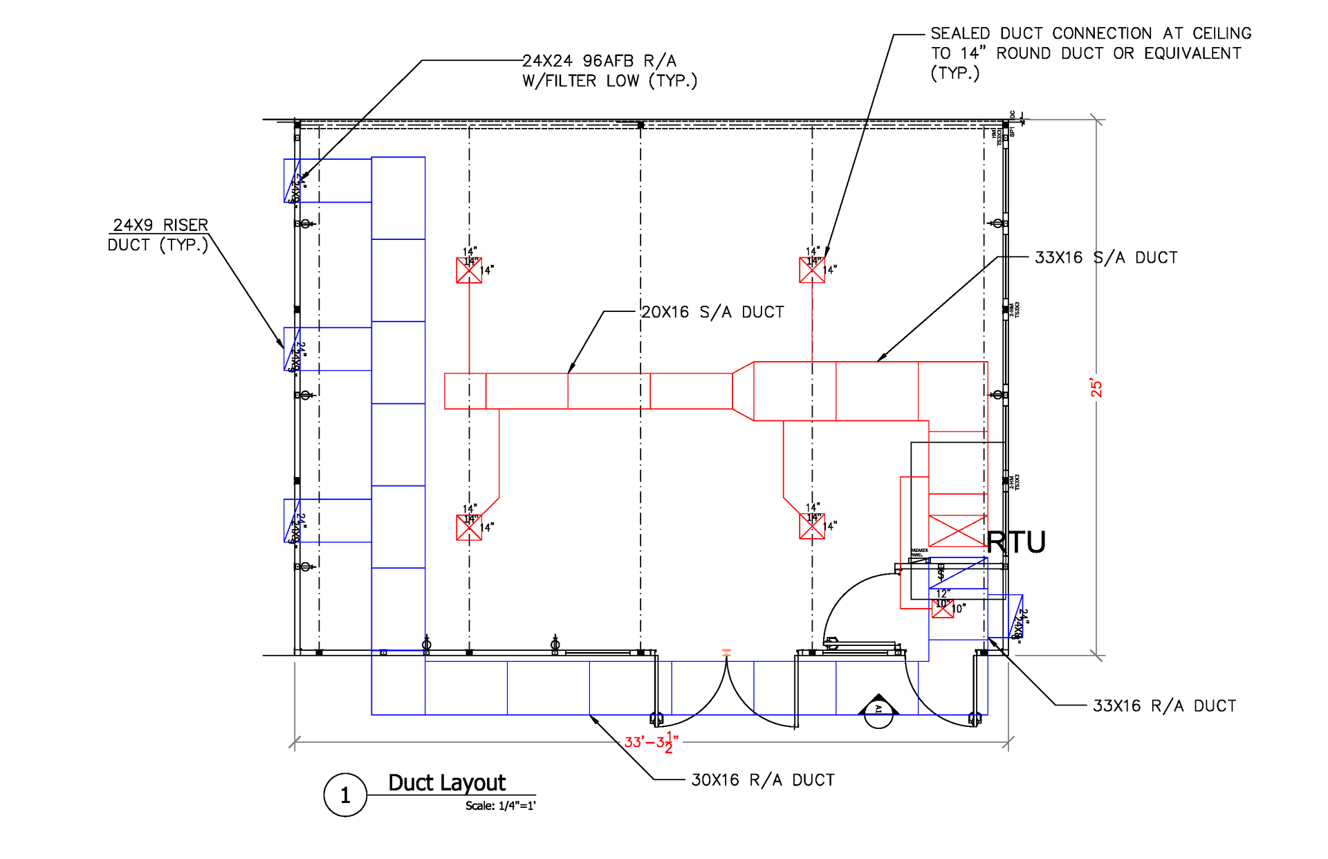 This layout details a 10-ton rooftop unit ducted to a clean room. The owner was able to dictate his intended design, U Innovations delivered a simple and effective duct layout.