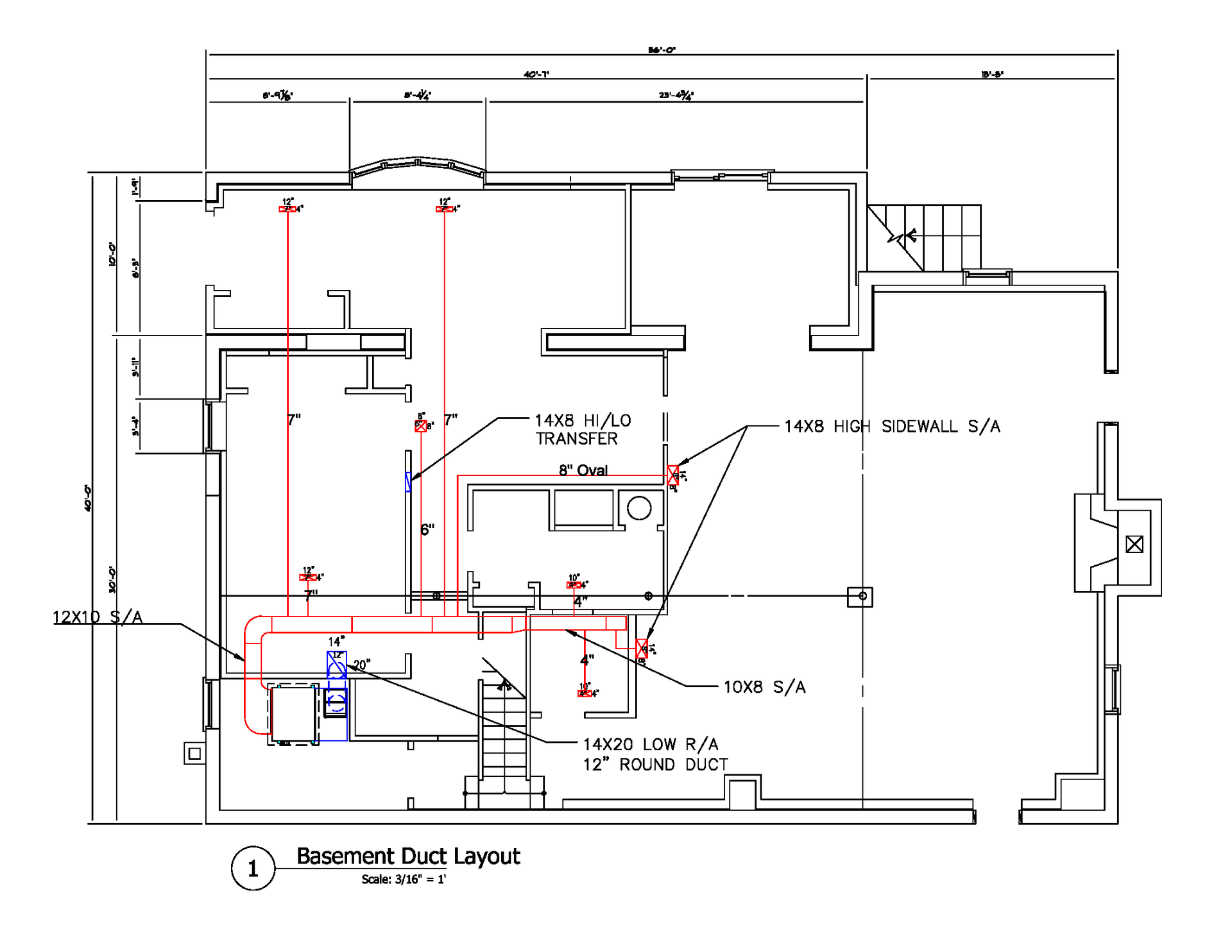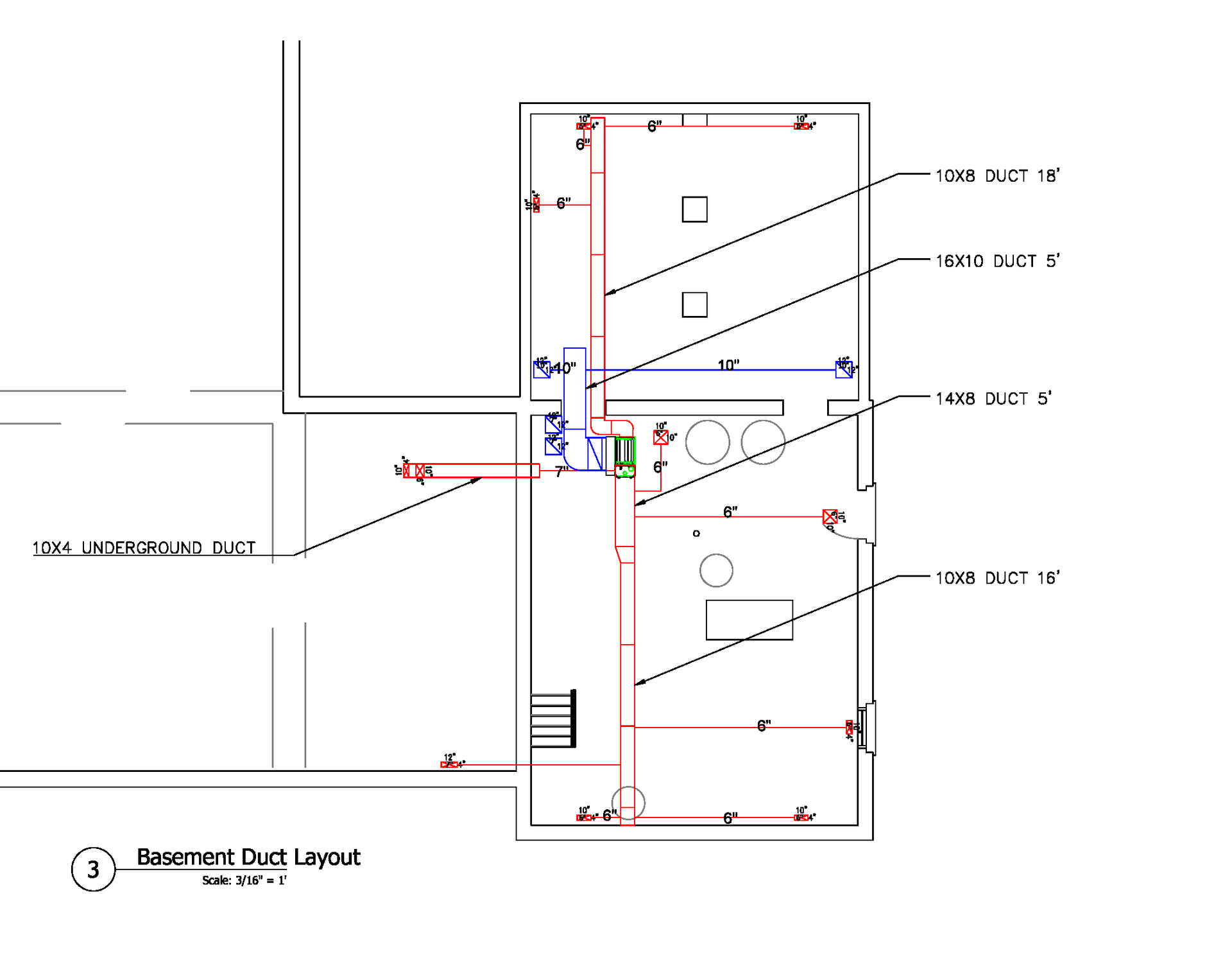 A basement furnace and duct layout. This drawing allows an installation manager or foreman to easily fabricate the correct amount of ductwork.